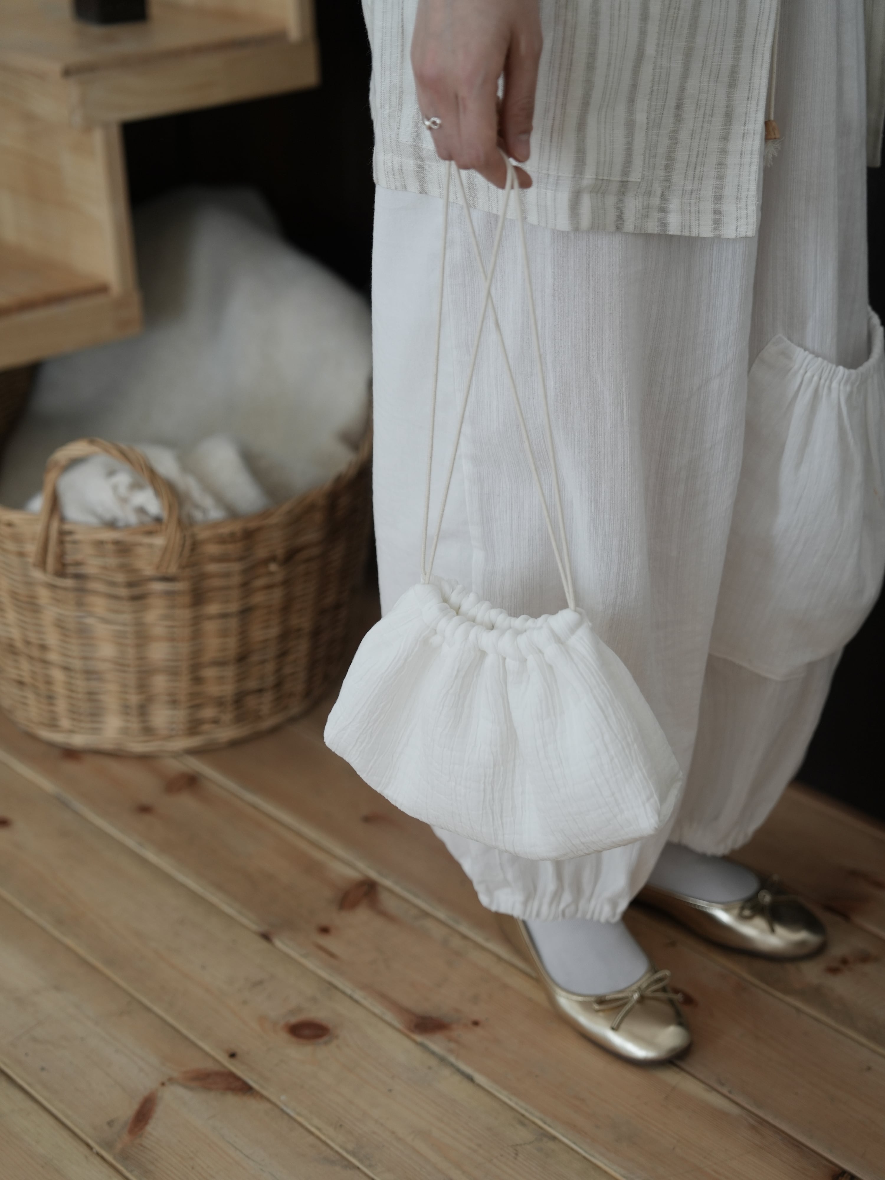 ほのかな透け感のあるチェックパターンの素材で製作されたストリングポーチです。