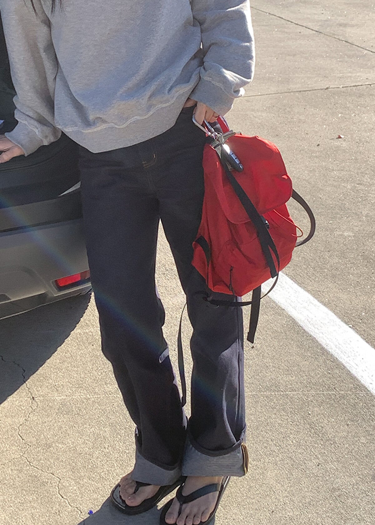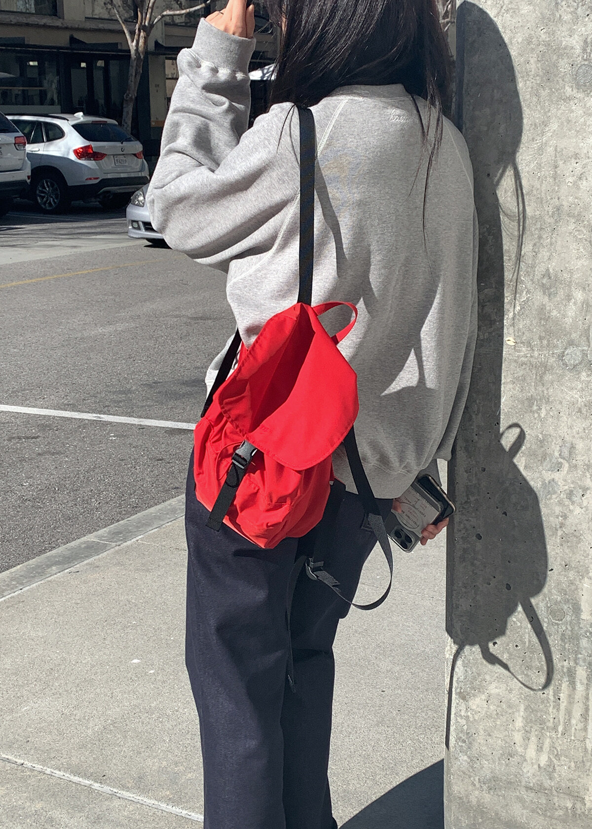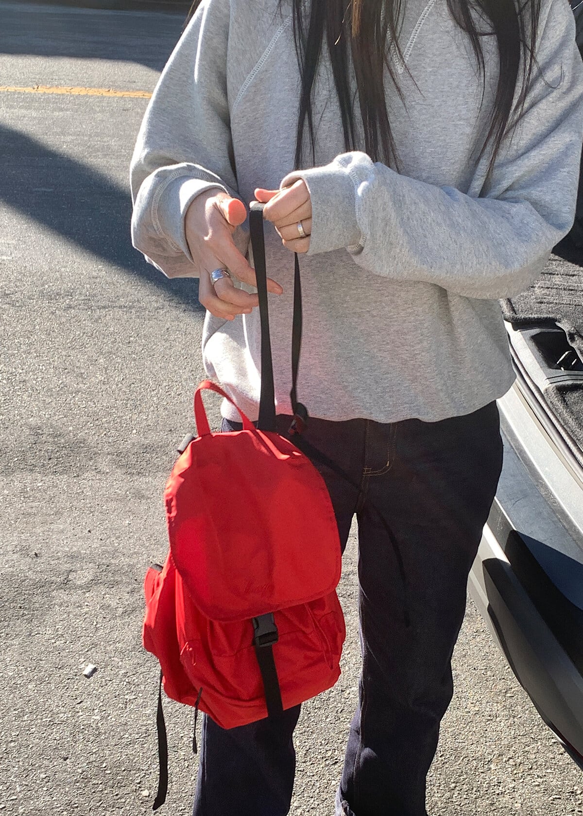 ストリングで締められるボディに、それを覆うフラップが適用されたバックパックで、内側にはゆったりとした内ポケットがあります。