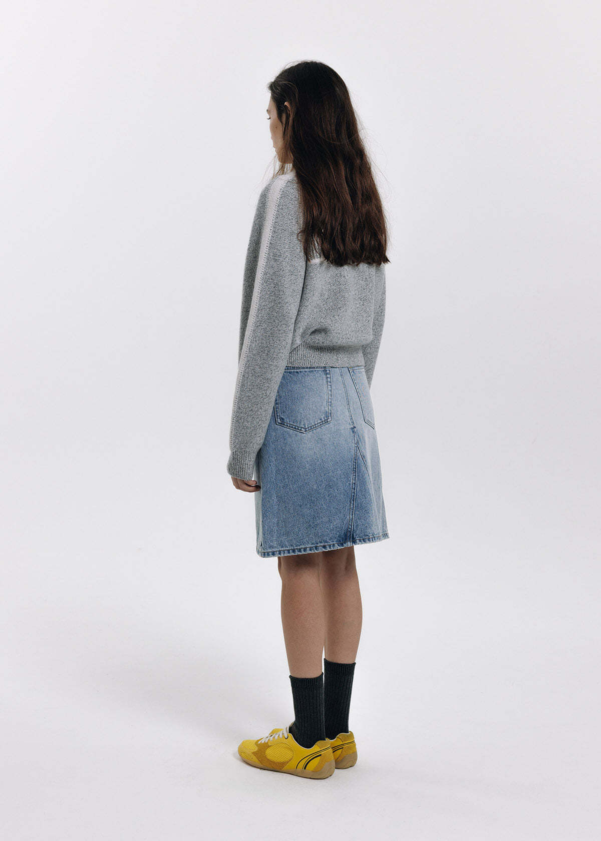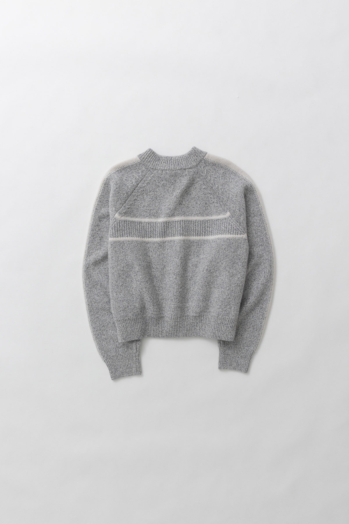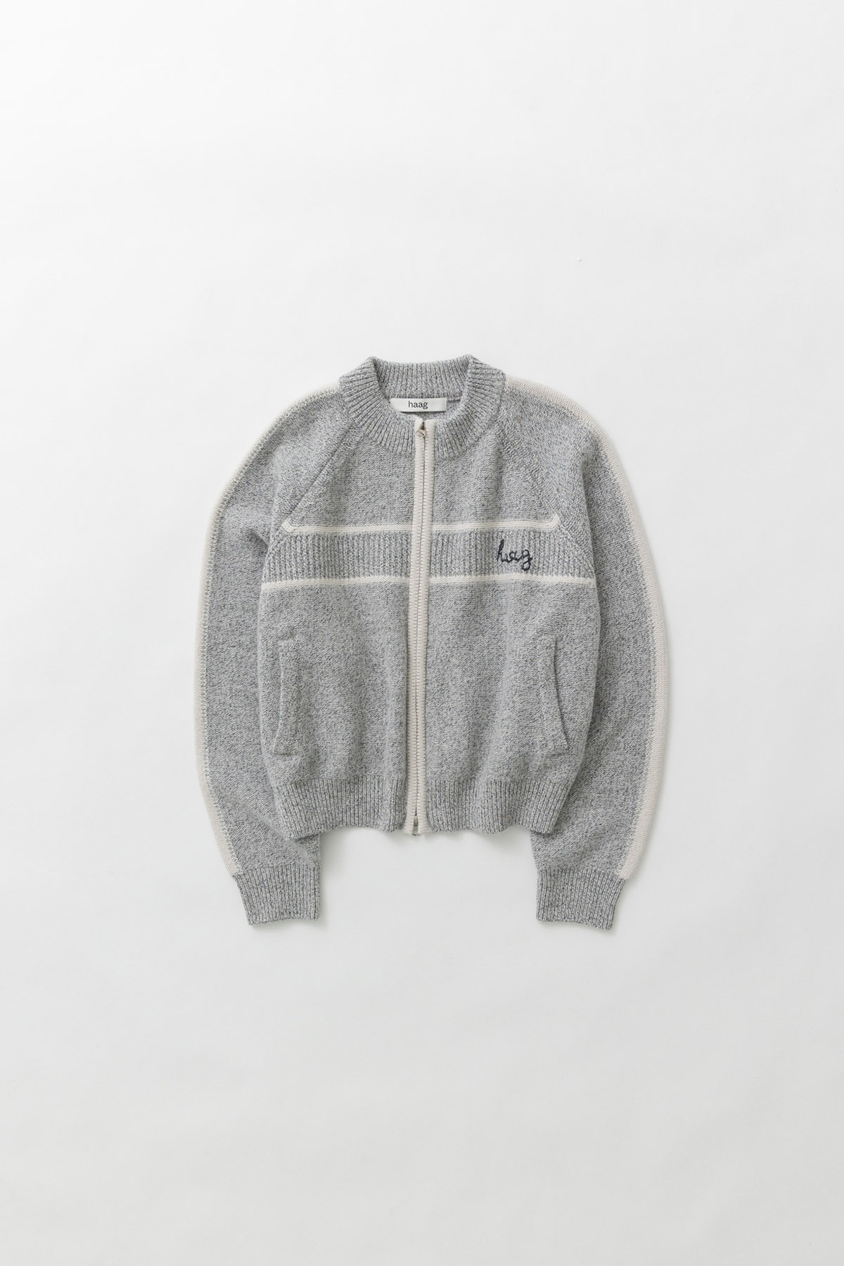 2色をミックスした奥行きのあるメランジカラーが魅力で、胸元・袖ライン・ジップ周りに施した配色ディテールが、さりげなくもユニークなアクセントを添えます。