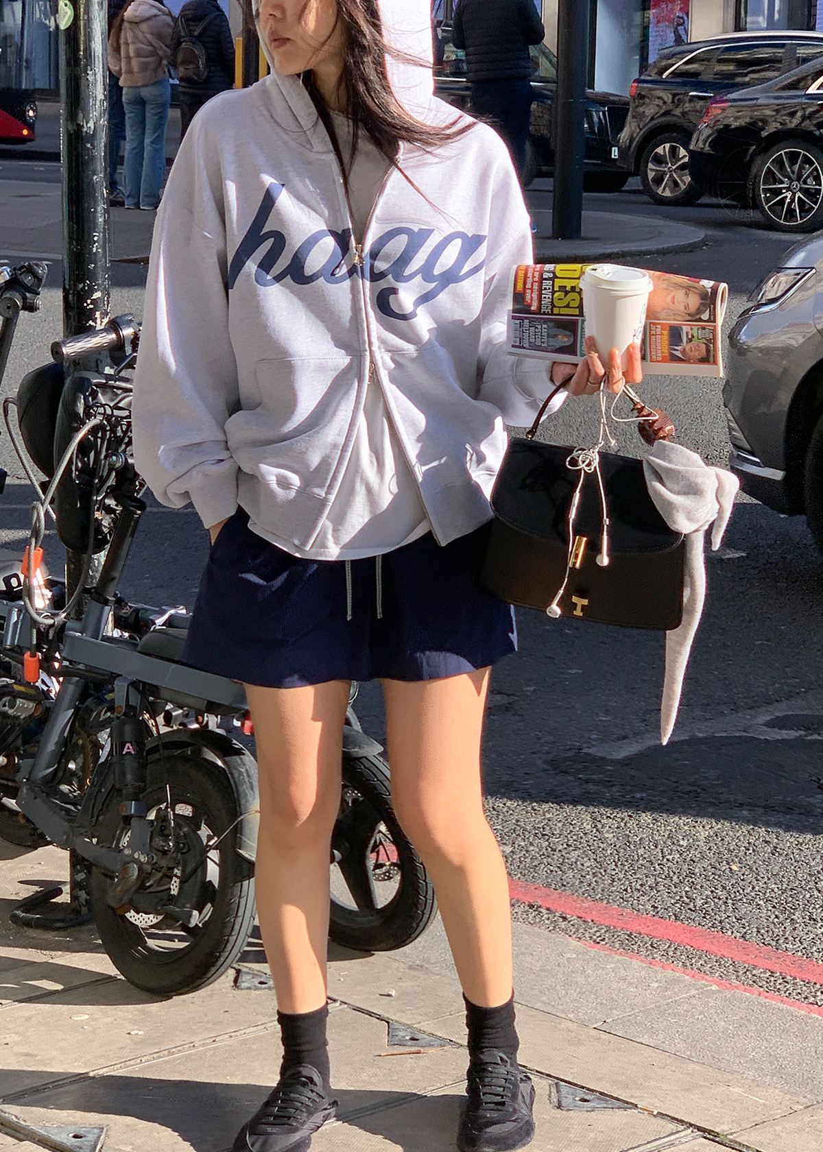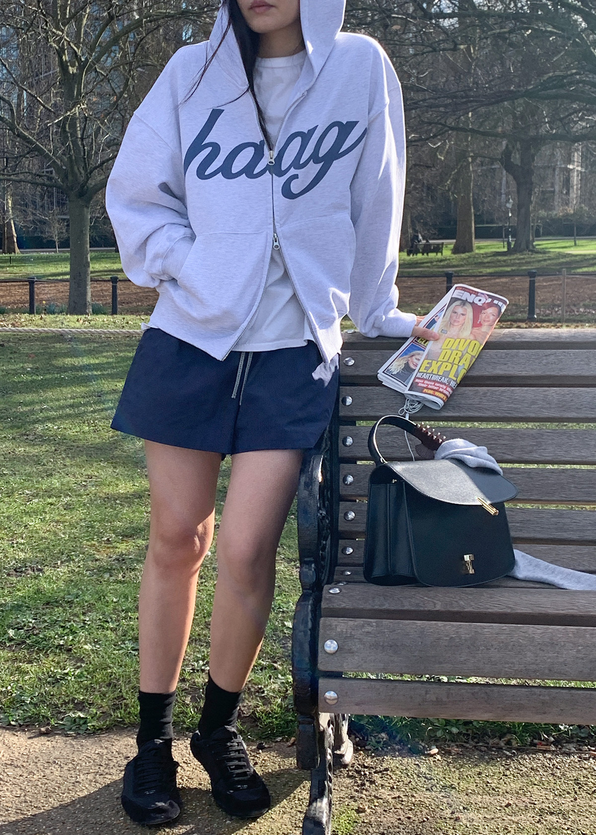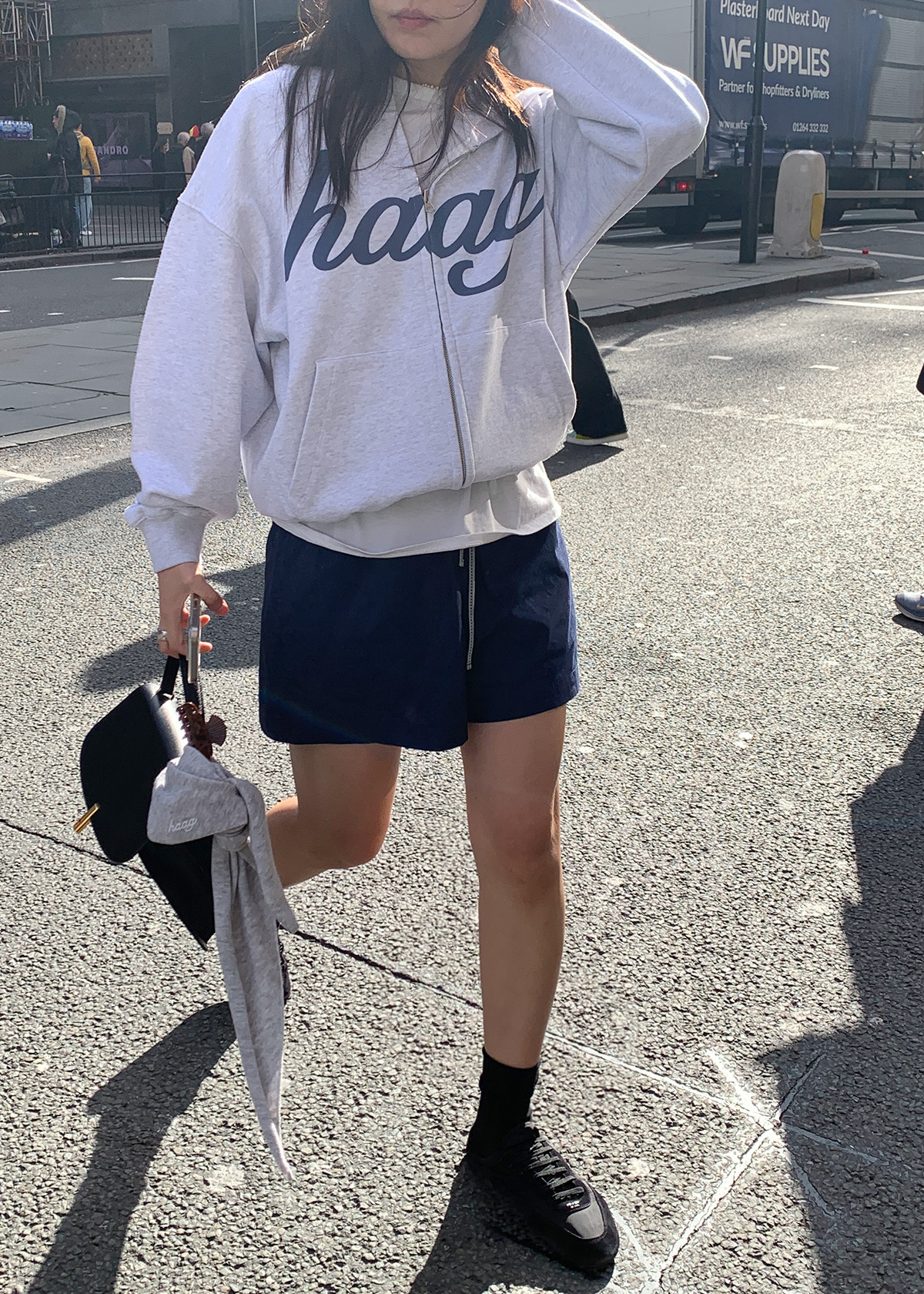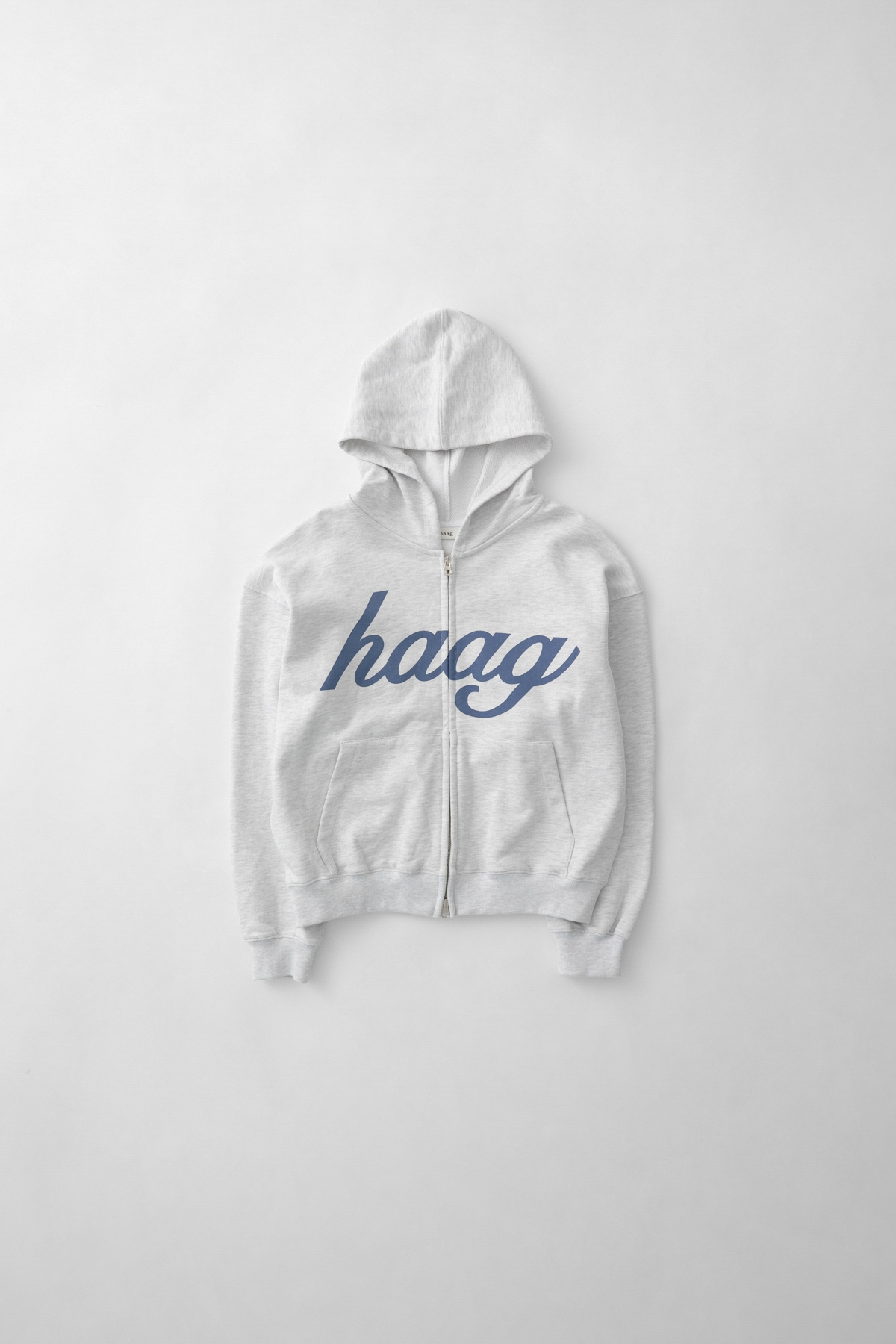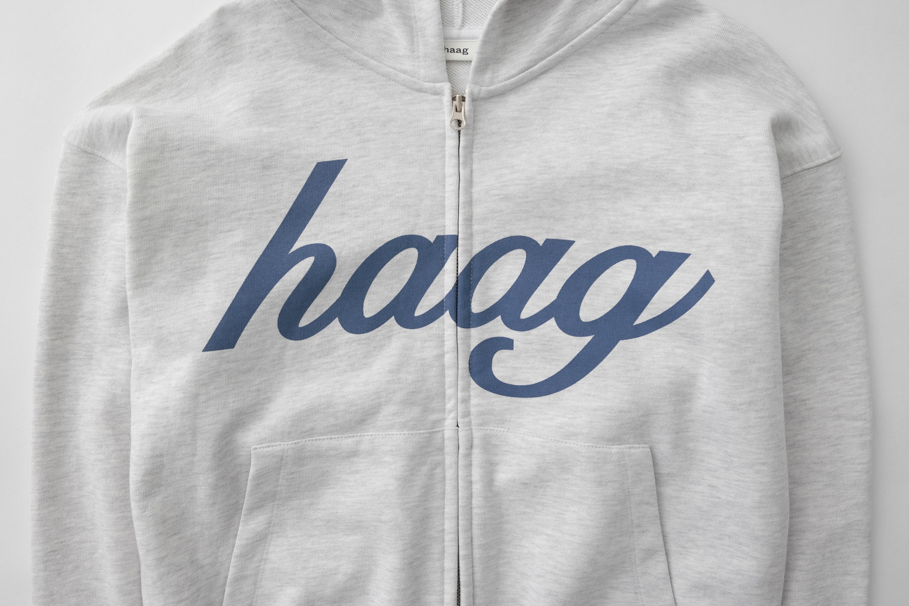 フロントにはhaagのシグネチャーロゴプリントを配し、シンプルながら印象的なアクセントに。ジッパーが見えないようプラケット(前立て)を施し、ロゴディテールをすっきりと完成させました。