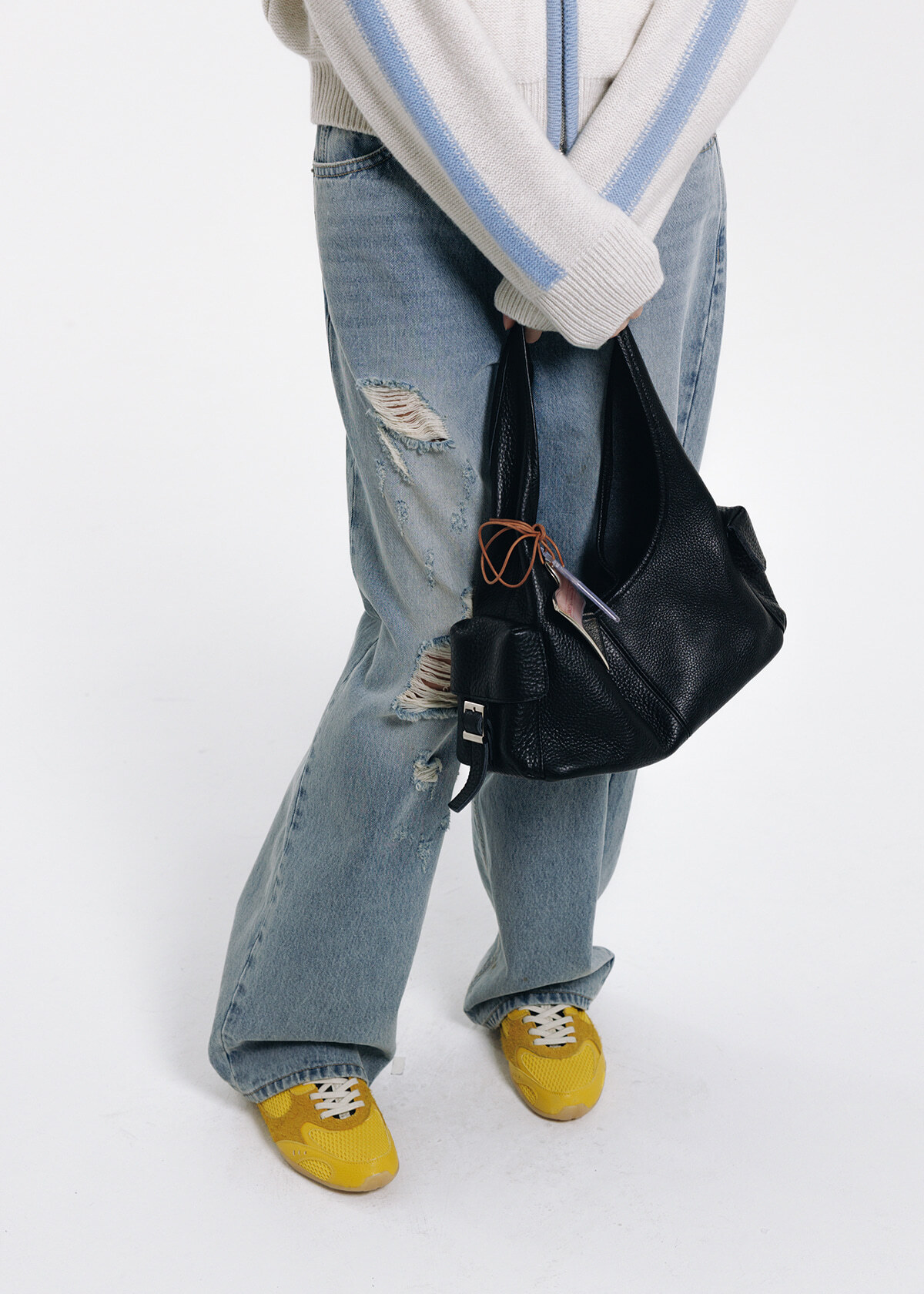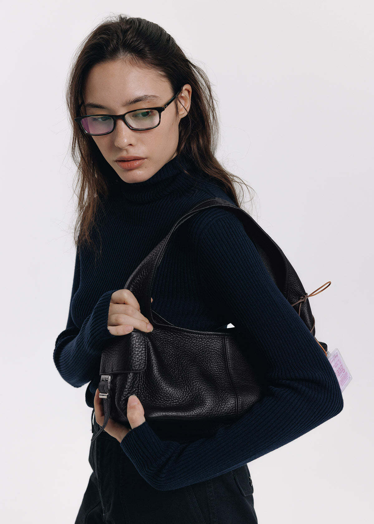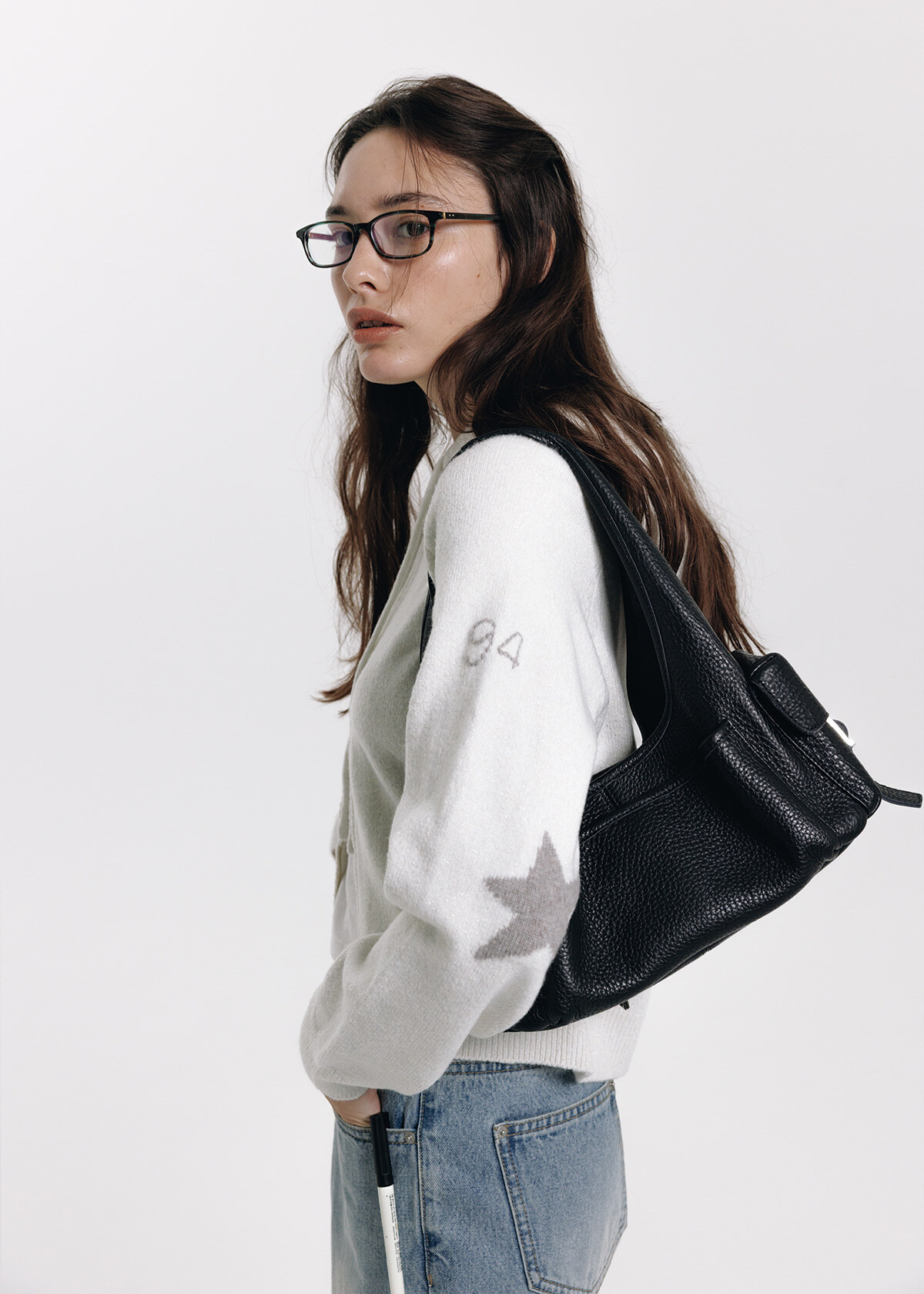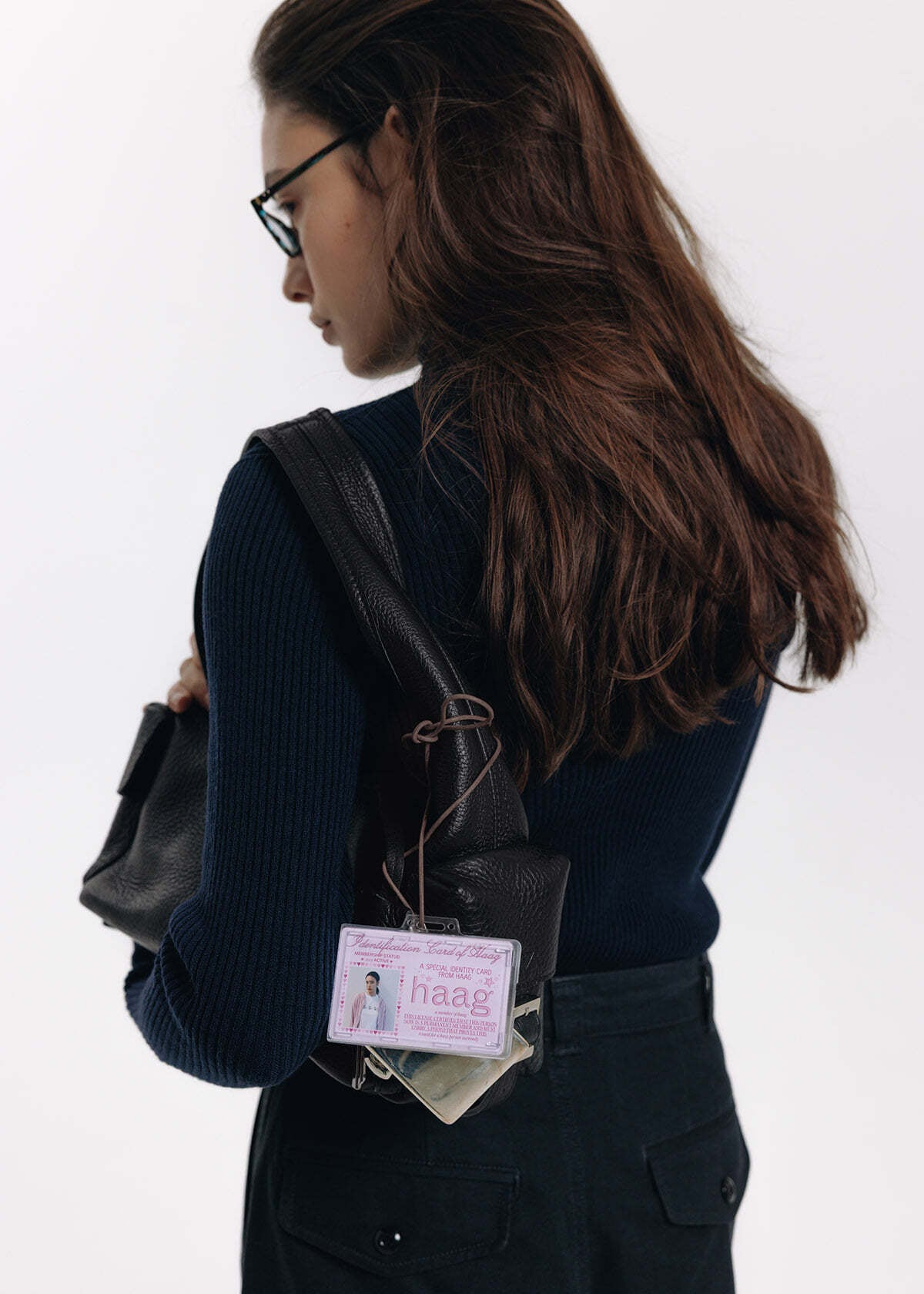 ポケットのシルバーバックル、haagロゴ刻印入りのキー&ハートチャーム、スタイリングの幅を広げるOリングが、レザーとの美しいバランスを生み出します。
