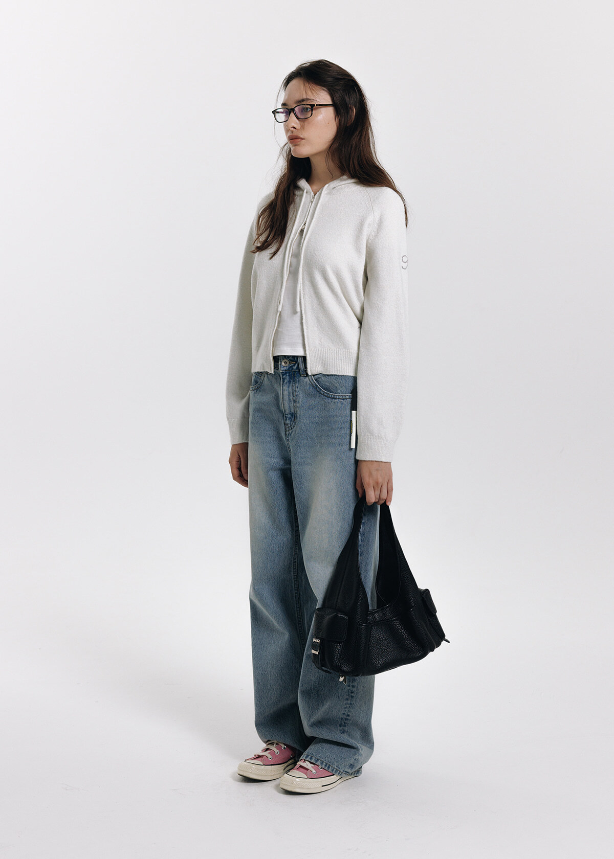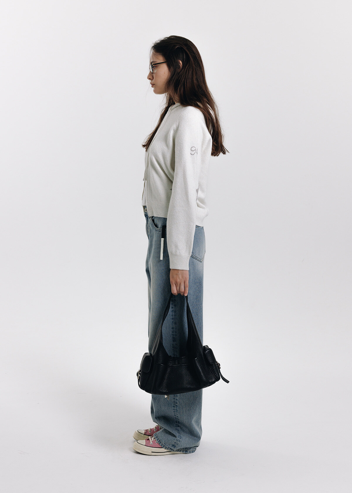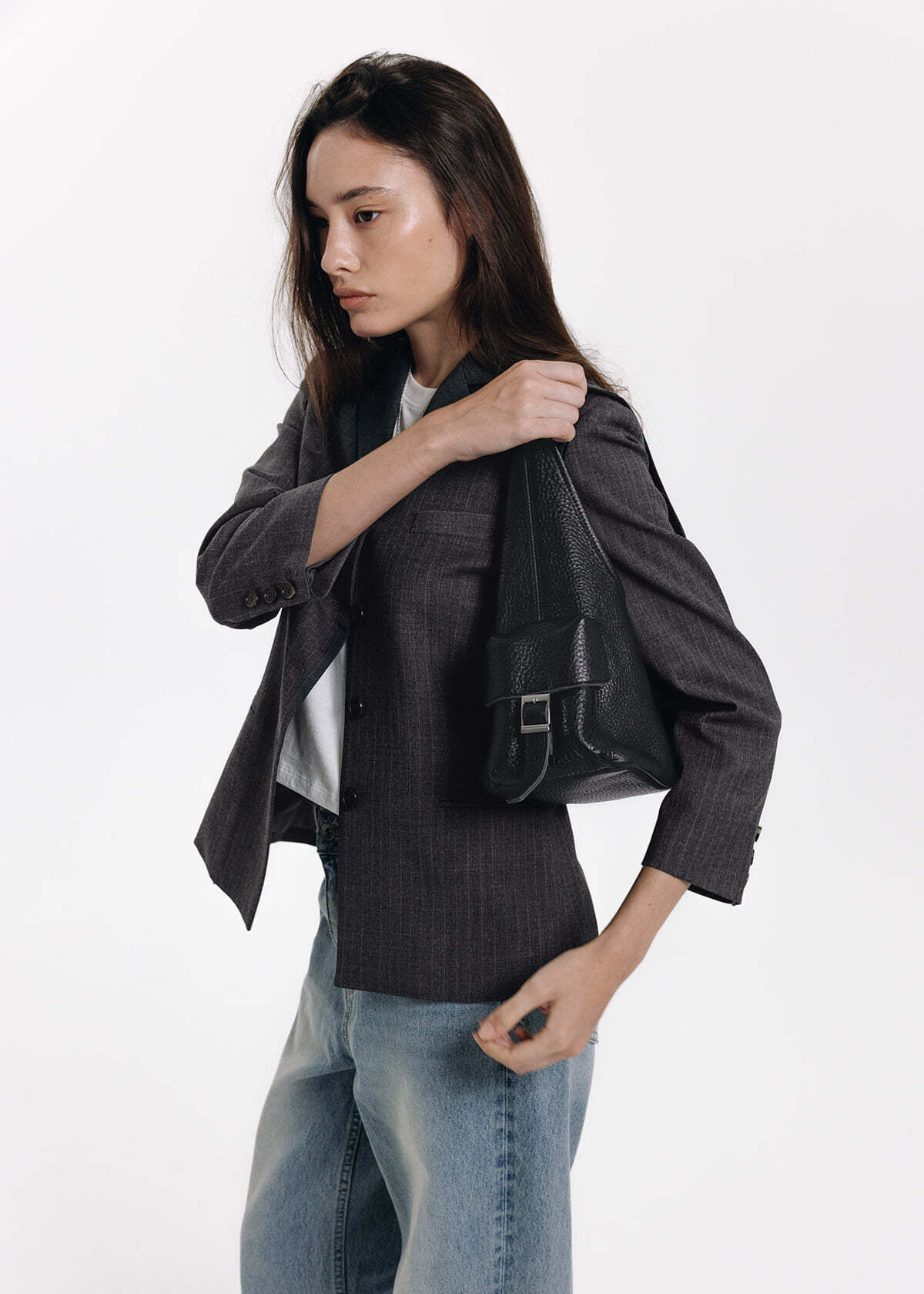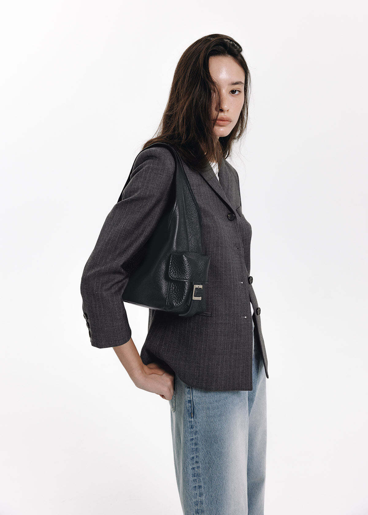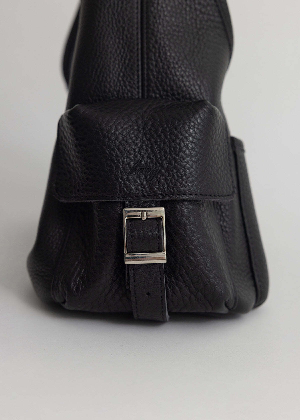 ポケットのシルバーバックル、haagロゴ刻印入りのキー&ハートチャーム、スタイリングの幅を広げるOリングが、レザーとの美しいバランスを生み出します。